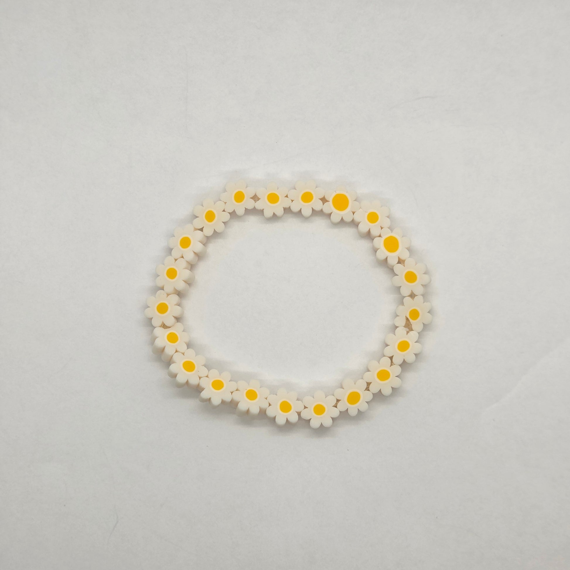 The Daisy Bracelet is a continuous string of small, white flower beads with a vibrant yellow center, offering a playful and delicate look.