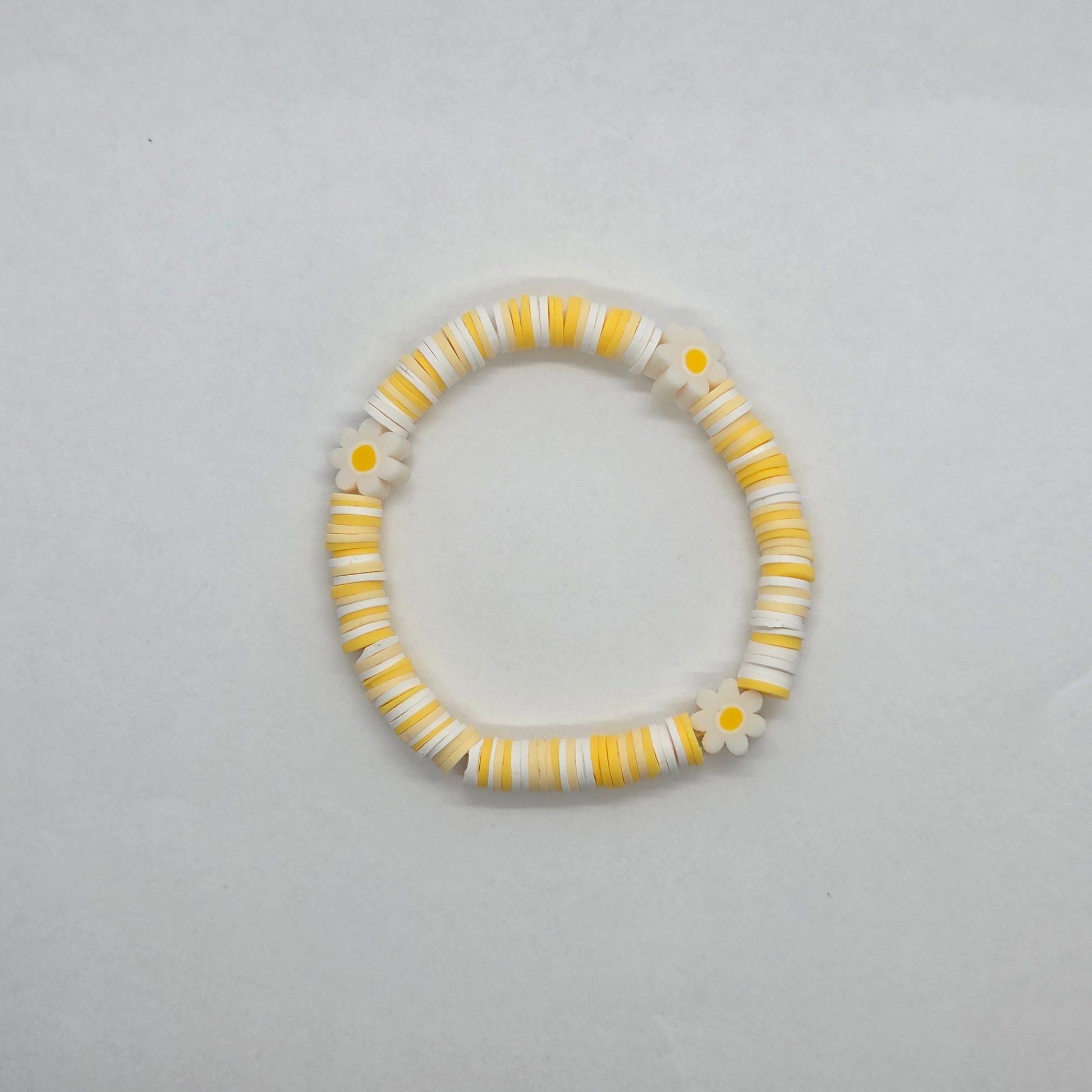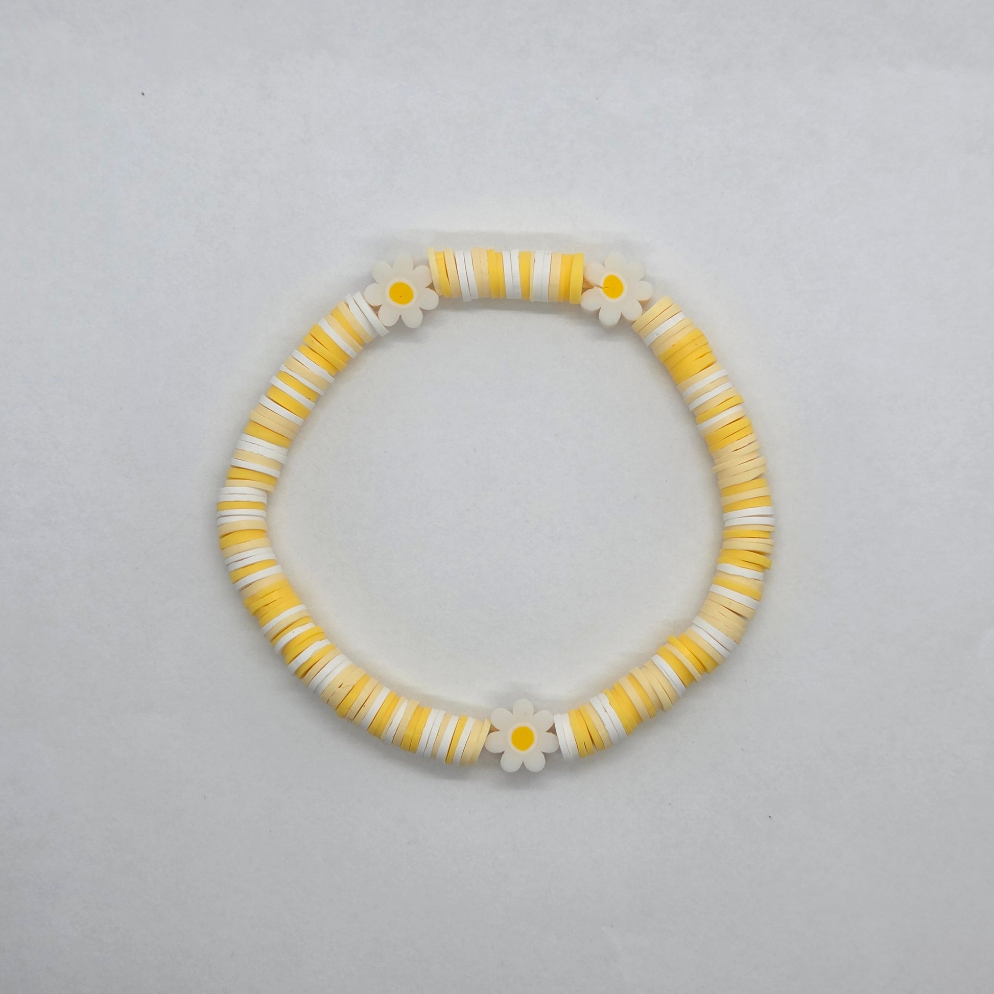The Heishi Bead Bracelet is made of flat, disc-shaped polymer clay beads, alternating in sunny yellow and crisp white stripes. It is accented with a few of the small daisy flower beads for a cohesive design.