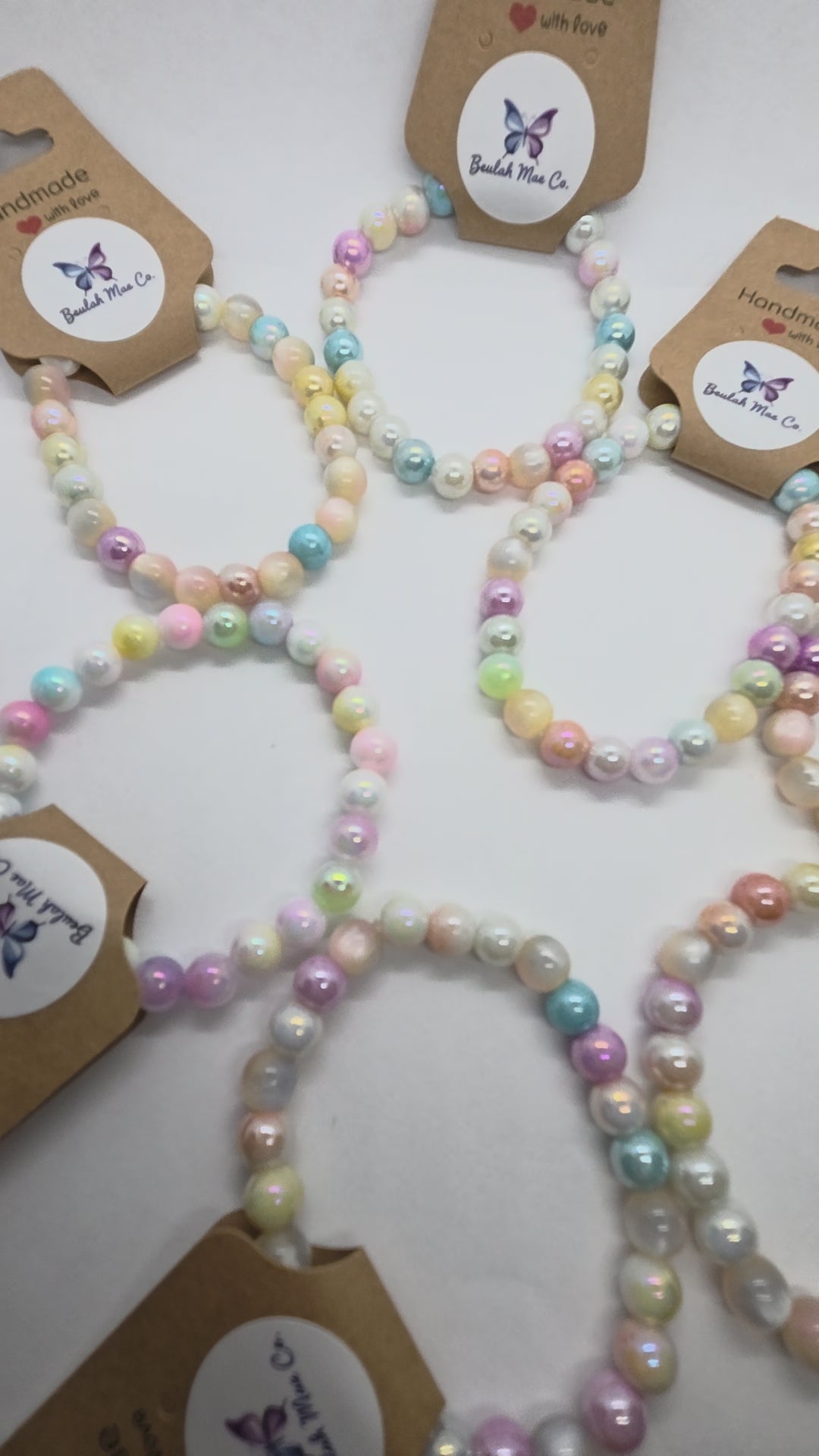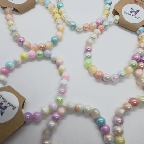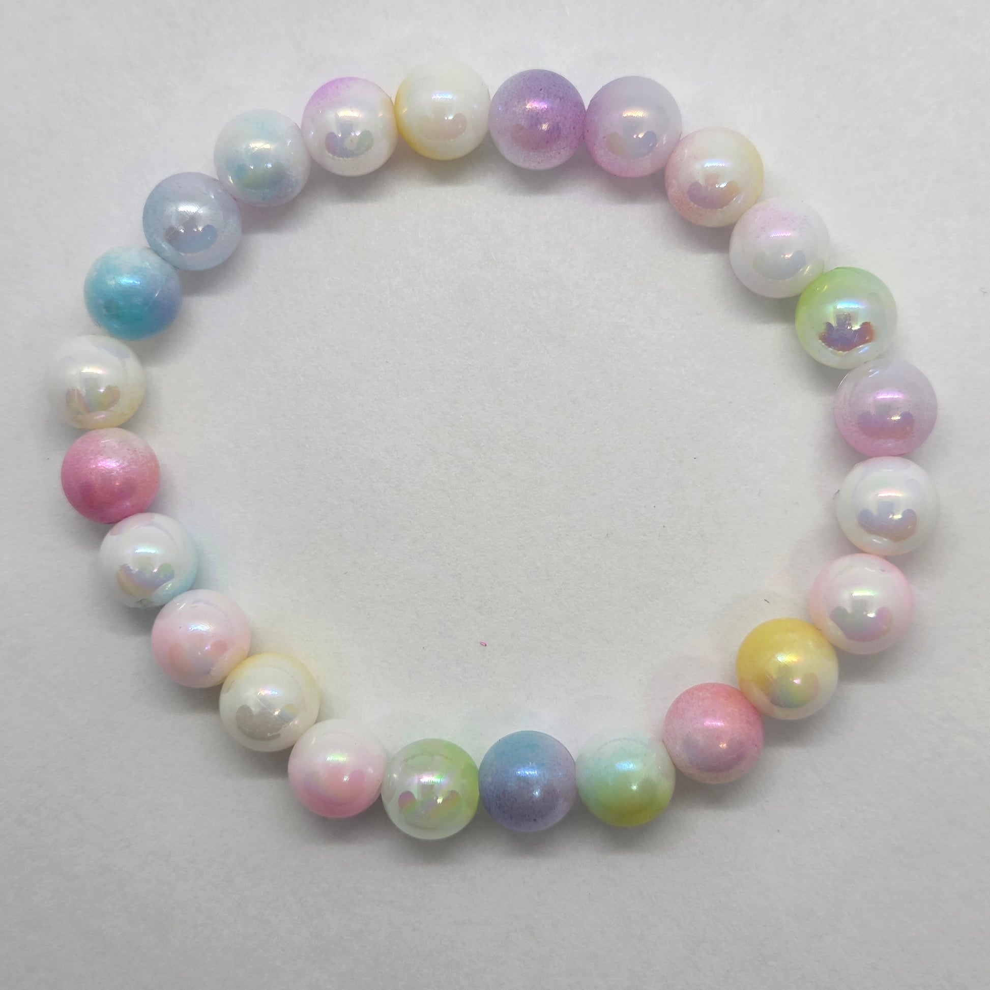Step into a fantasy with this enchanting Iridescent Pastel Glass Beaded Bracelet. Each round glass bead shimmers with a glossy, opalescent finish, reflecting soft hues of pink, blue, purple, orange, green, and pale yellow. The iridescent coating gives it a magical, mother-of-pearl or "unicorn" effect. It’s perfect for adding a subtle glow and dreamy color to your everyday wear. Wear it to complete a magical costume, or stack it with simple bangles for a sophisticated yet whimsical look.