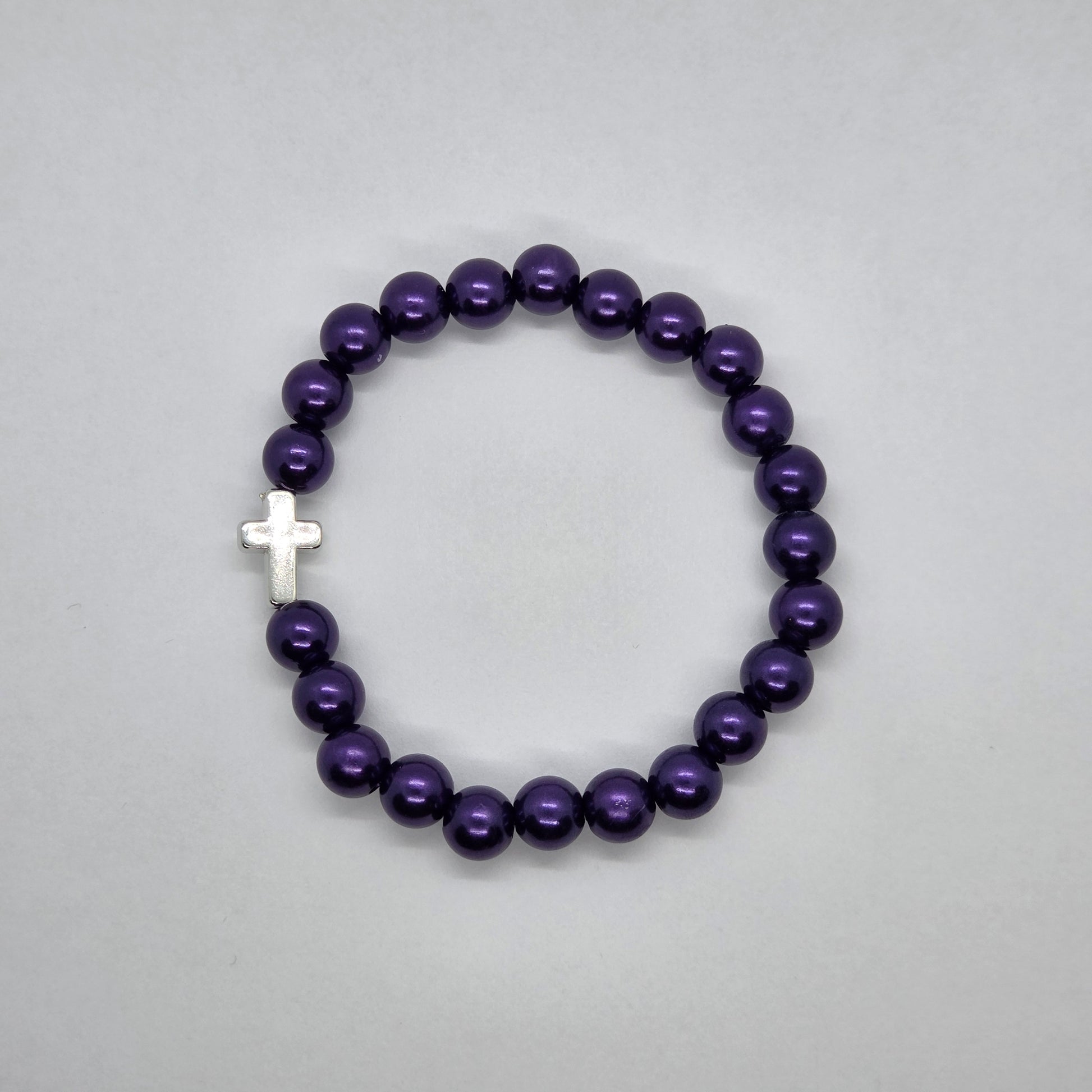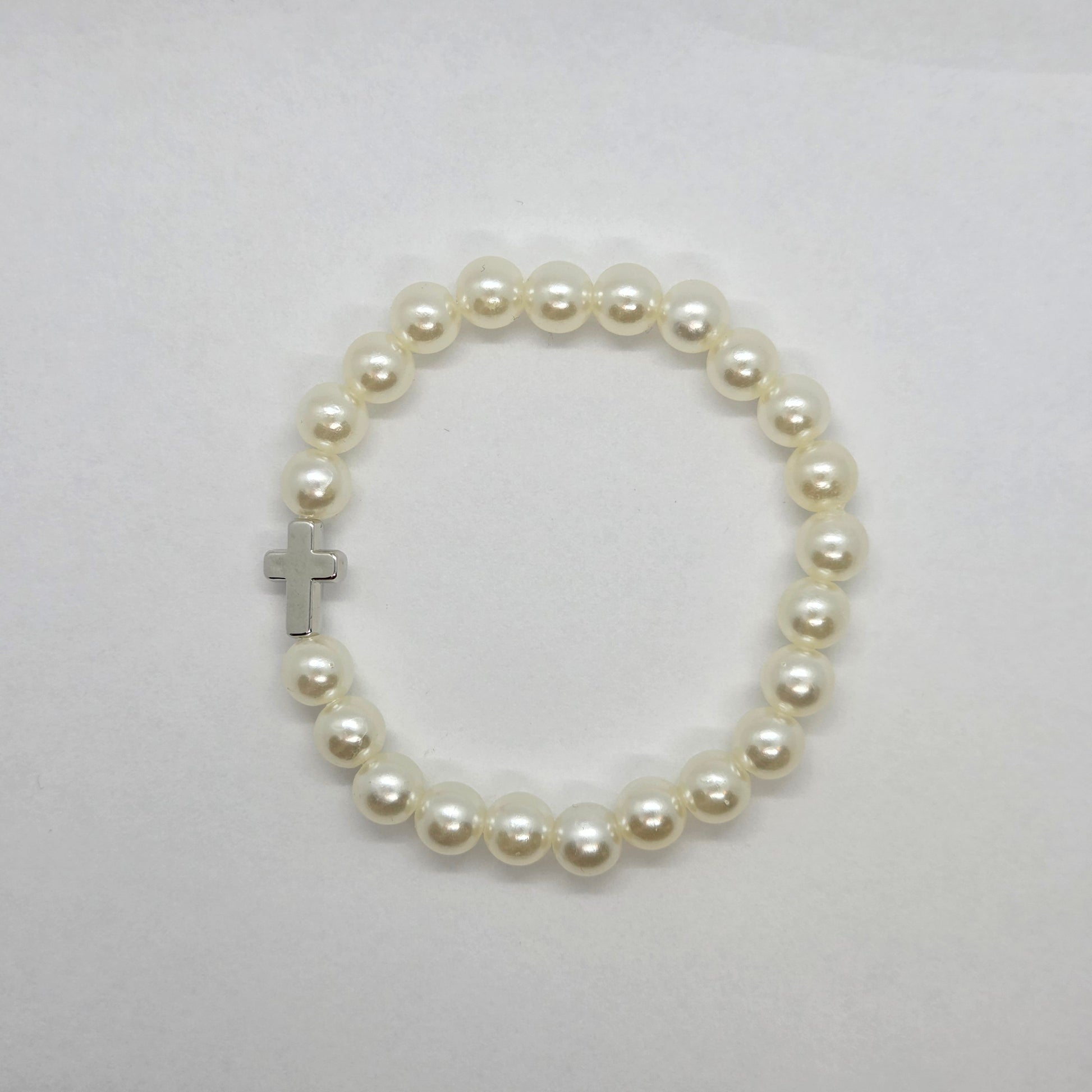 This charming stretch bracelet features iridescent, pearl-effect beads in soft shades. The subtle color palette is complemented by a simple, elegant silver-tone cross charm. Easy to wear and a thoughtful gift for confirmation, communion, or any special occasion.