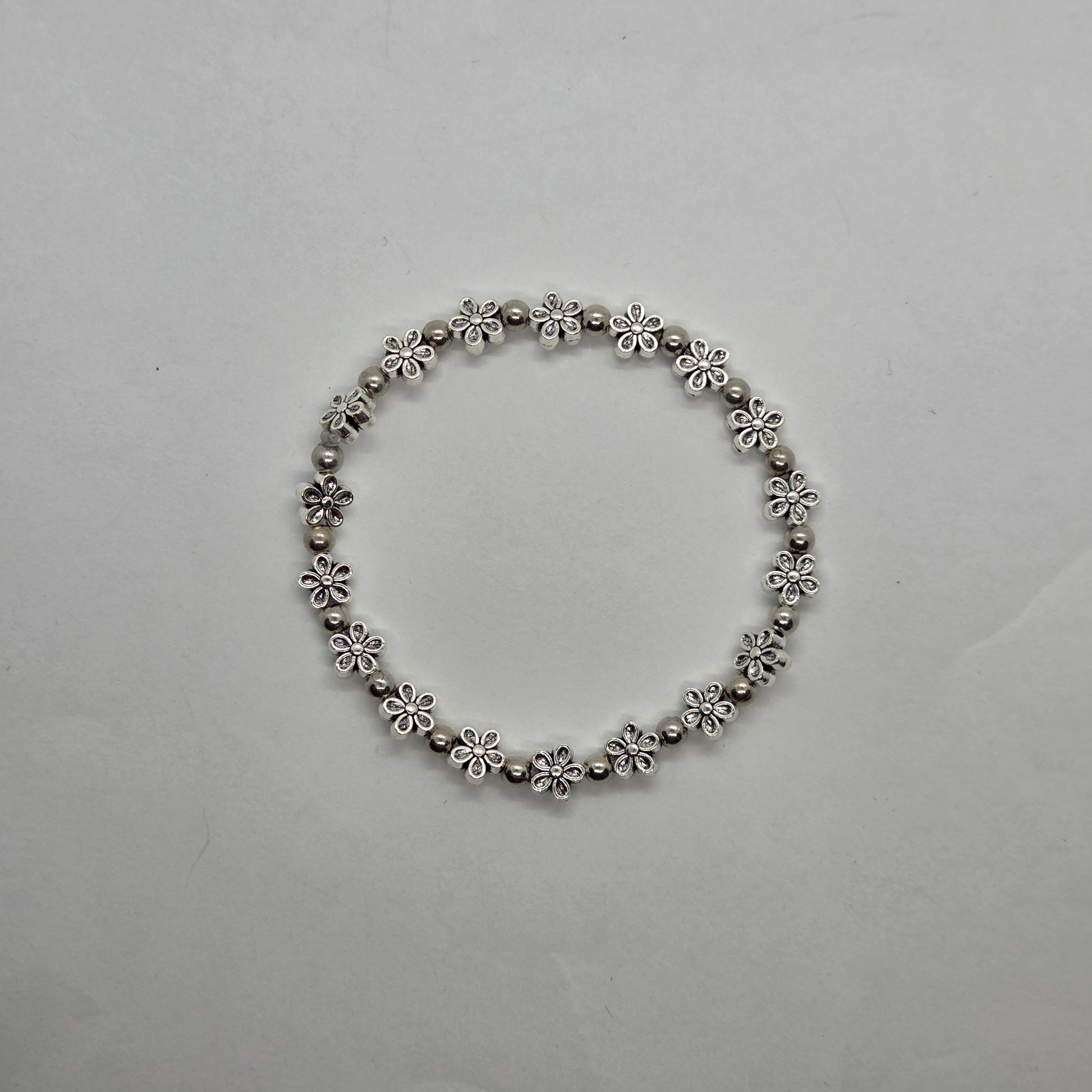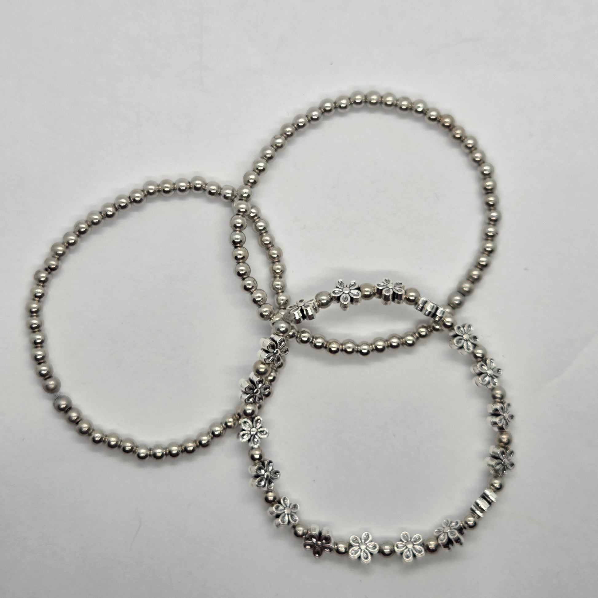 Floral Accent Bracelet: A charming bracelet featuring both small accent beads and detailed metal flower-shaped beads for a sweet, feminine touch. This bracelet is included in both sets of bracelets.