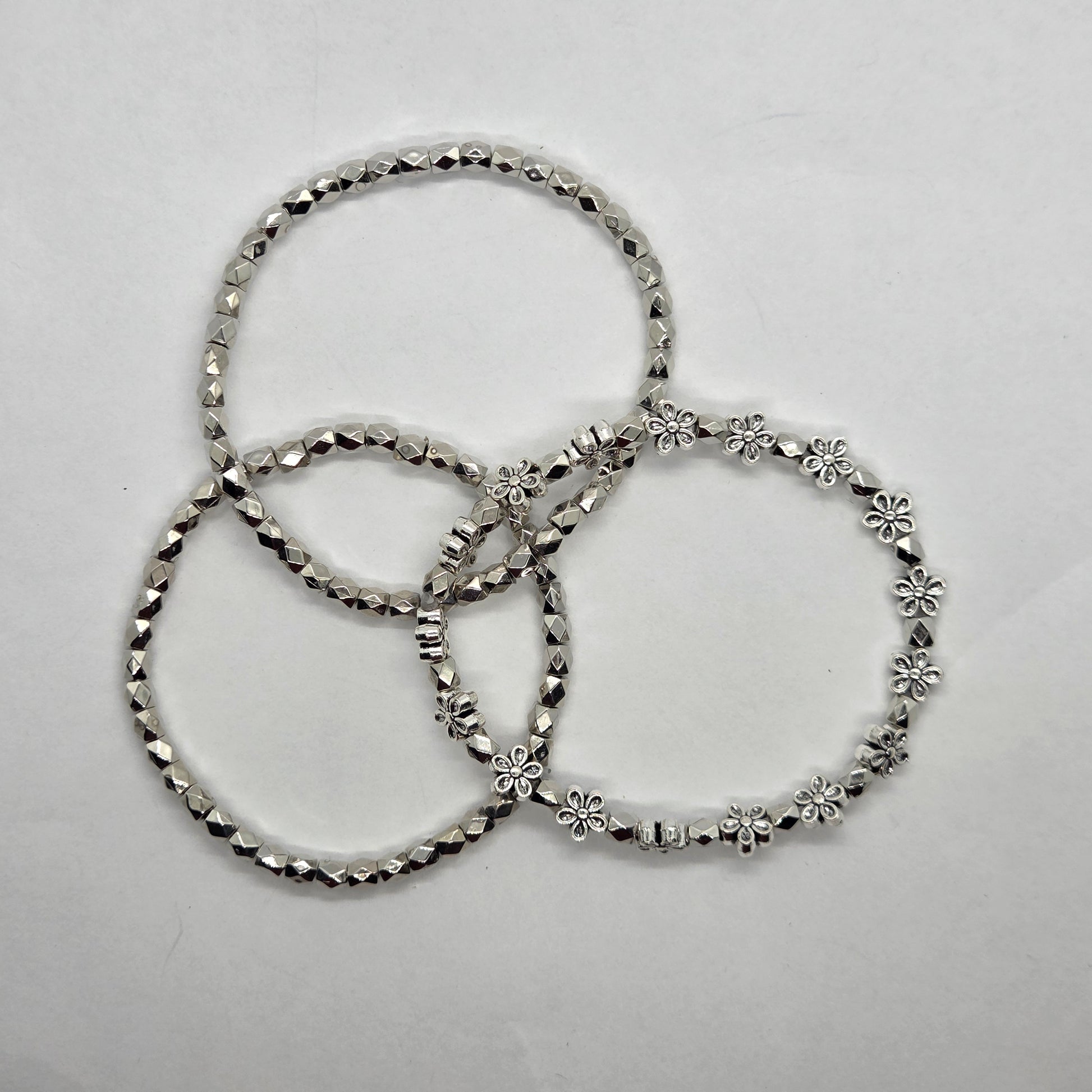 Wear all three together for a bold, textural statement, or mix and match with other pieces you already own. Made with durable elastic, these bracelets easily slide on and off and will comfortably fit most wrist sizes. The silver-tone finish and mixed bead designs make them perfect for layering, everyday wear, or gifting.