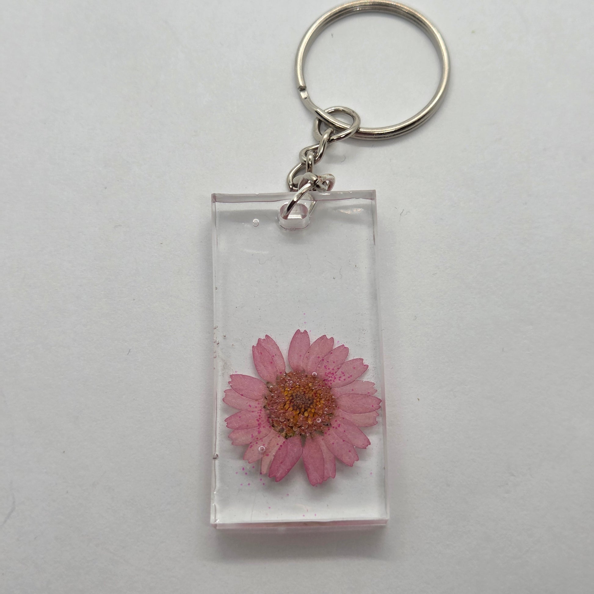 Unique Designs: Each keychain showcases a distinct floral arrangement, making it a one-of-a-kind accessory. The keychains pictured feature a lovely pink daisy-like flower and a delicate sprig of mixed pink and white blossoms.